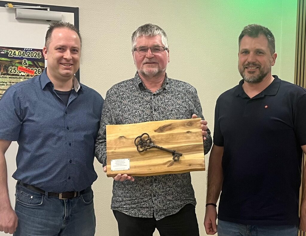 Im Rahmen der Jahreshauptversammlung des Bürgerschützenvereins Menzelenerheide 1879 e.V. wurde Michael Thelen nach 21 Jahren engagierter Vorstandsarbeit als Beisitzer für die Schützenhausverwaltung verabschiedet und für seine Verdienste geehrt. Als sichtbares Zeichen des Dankes überreichten Präsident und Major einen symbolischen Schlüssel des Schützenhauses.